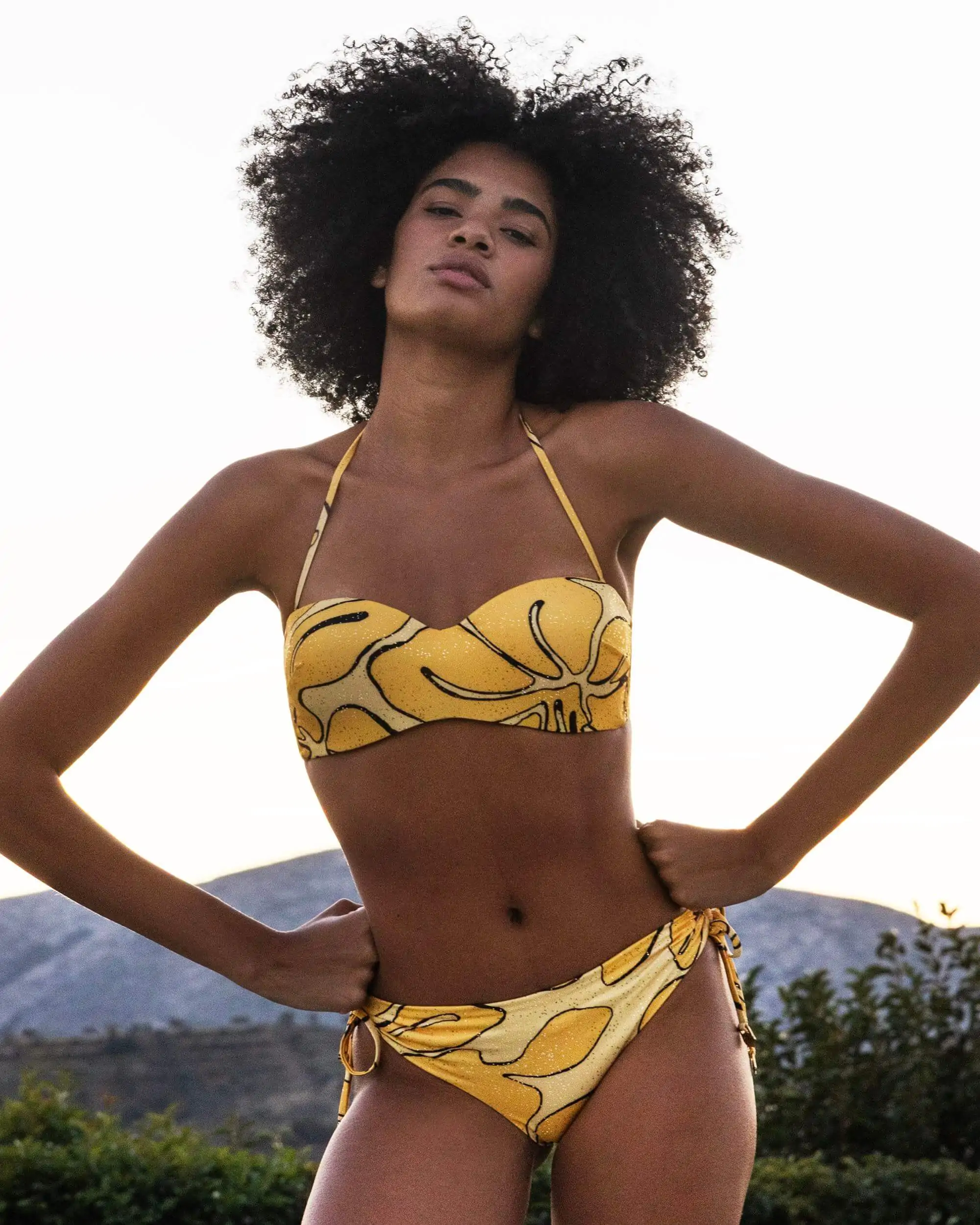 Strapless bikini with gentle underwire design with back fastening and adjustable ties at the bottom
