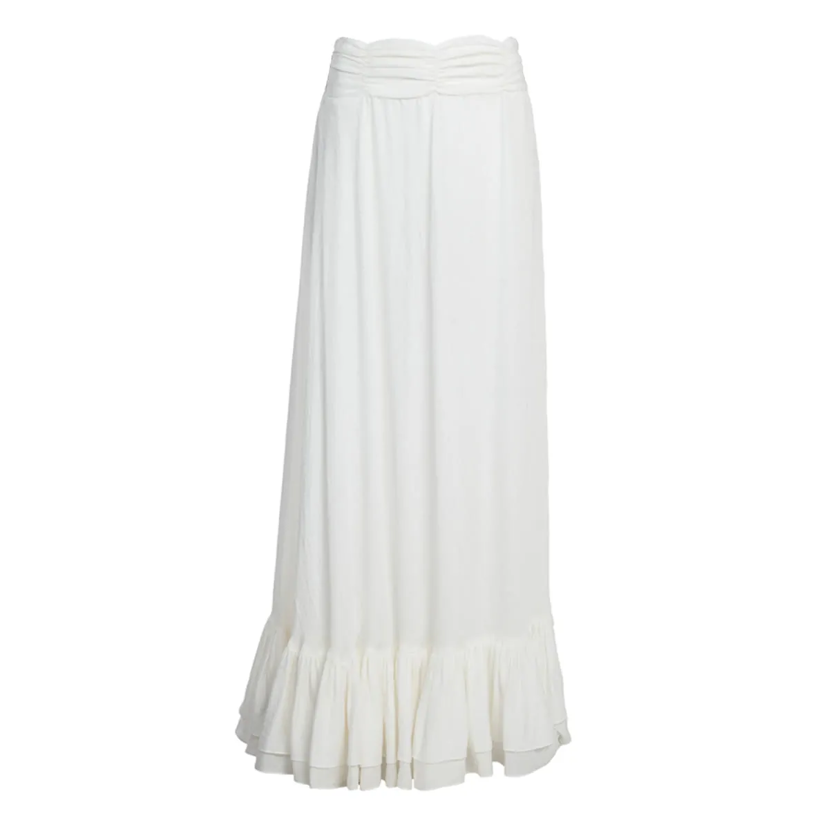 Maxi skirt with shirred waistband and tiered ruffles at hem.