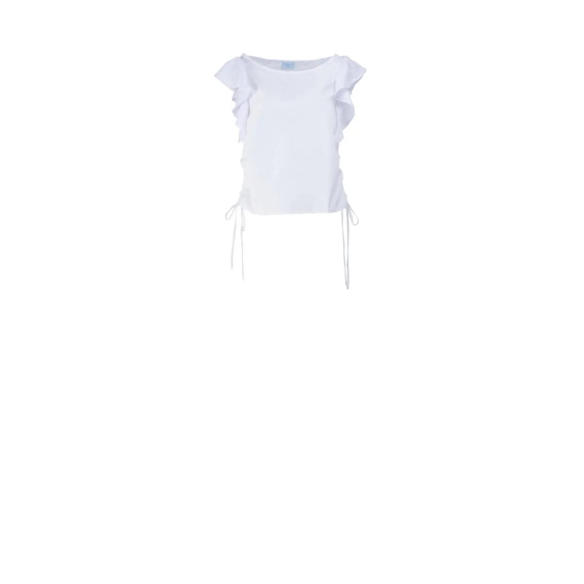 "Herina" top has the most comfortable fit. It is cut from a delicate organic gauze with ruffled trims on the shoulders and drawstrings at the side seams for customized length, either cropped or waisted.
