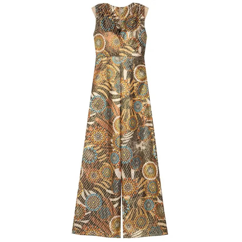 This retro inspired wrap jumpsuit sculpts beautifully around the body frame. Cut from an vintage look metallic fabrication, it has a fitted bodice and wide bell-shaped legs. Handcrafted inserts at the shoulders, flatter the silhouette further, while completing an unforgettable look in pure elegance and style.