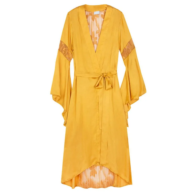 A midi length kimono that can be worn open over an outfit, or belted as dress. Asymmetrical hemline creates a flattering figure, while retro bell sleeves and lace details at the back and sleeves, complete eastern bohemian elegance.