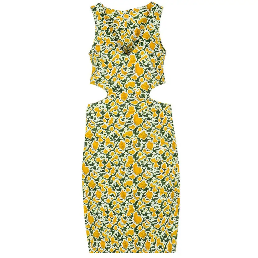 Made from a leather like fabrication that's embossed with a cool croc-effect, this midi style has a V-neckline that elegantly frames the décolletage and it is trimmed with pipping details to shape powerfully around the body frame. Side openings define further the waist, while an open back waist and shoulder inserts create a beautiful balance in body proportions.