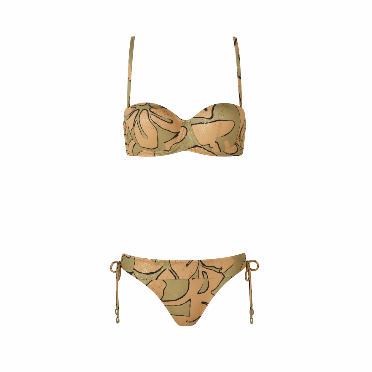 Strapless bikini with gentle underwire design with back fastening and adjustable ties at the bottom