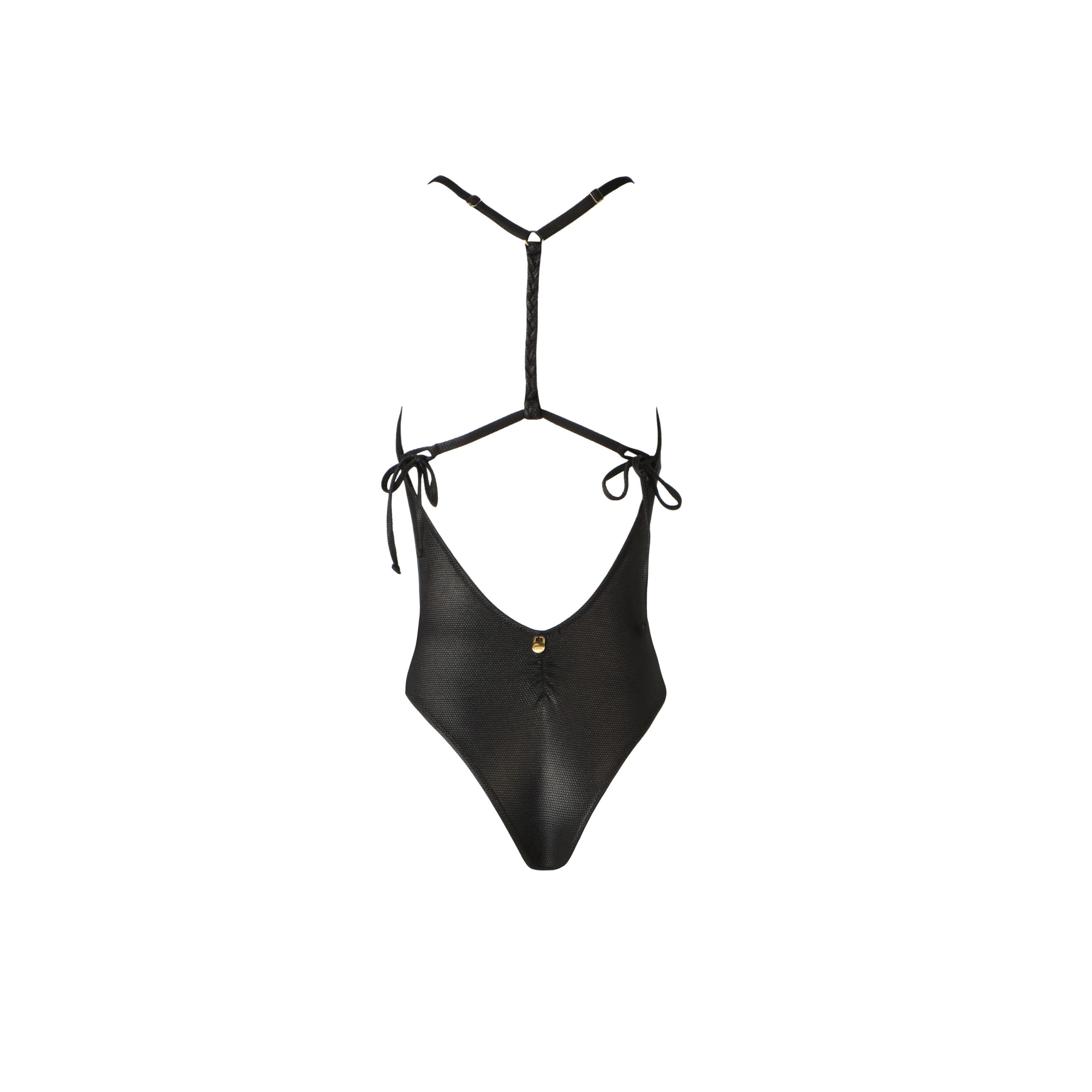 One piece with braided back design and deep open back