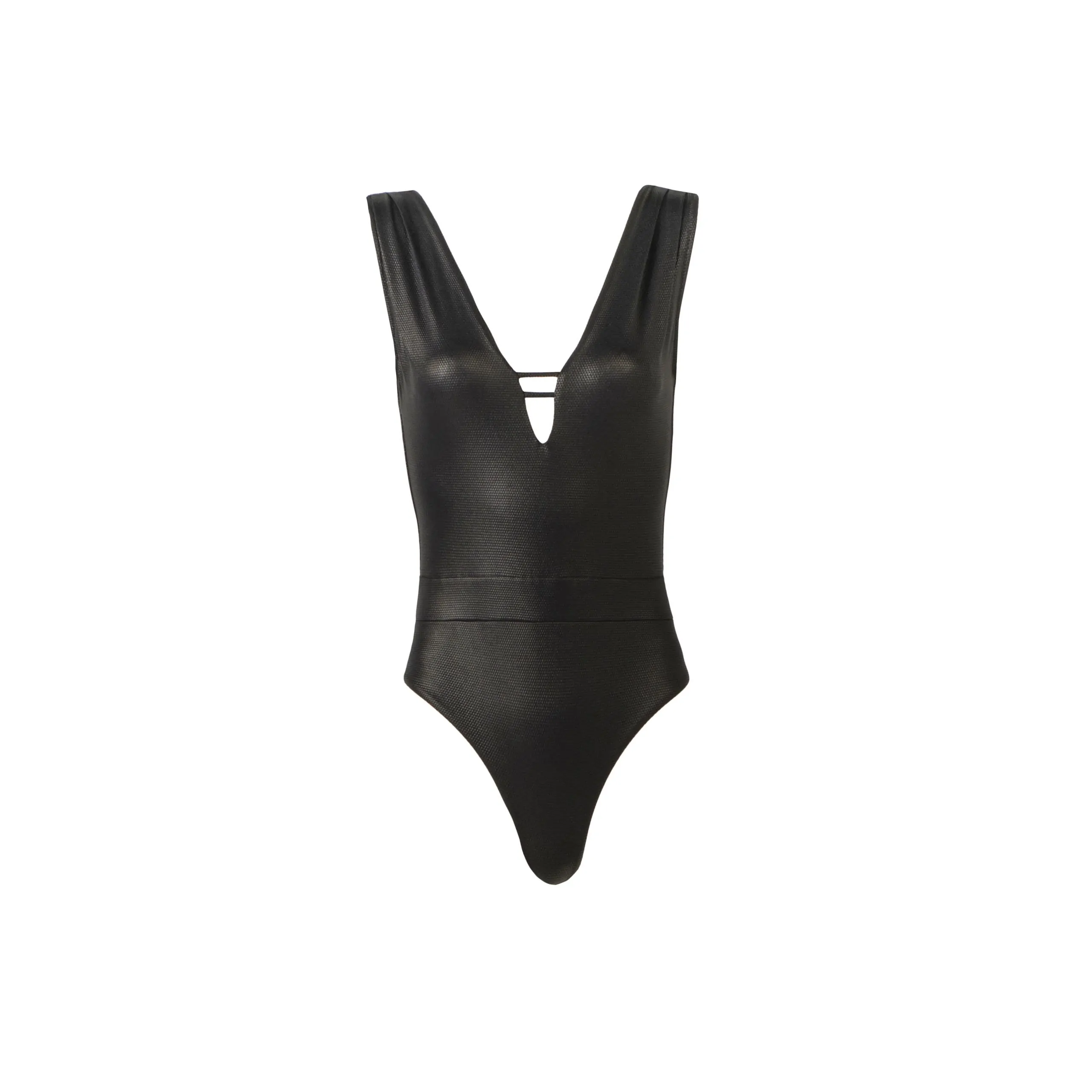 One piece with pleated shoulder design, plunge neckline, open back and removable pads for gentle lift and support