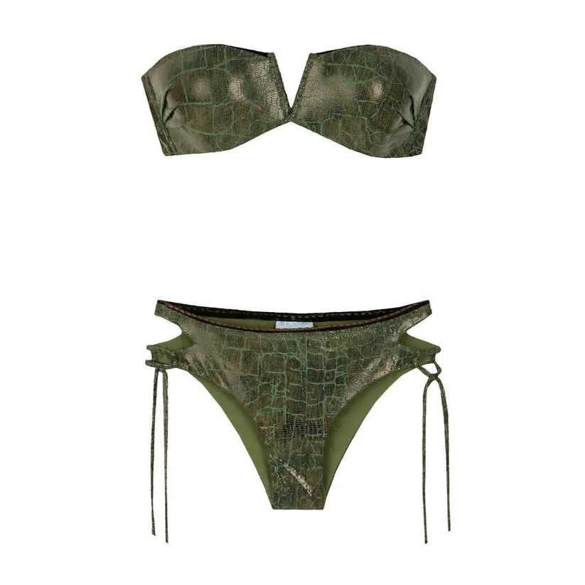 Ένα εξαιρετικό straplesss μπικίνι με μοναδικά κοψίματα, για αυτές που γνωρίζουν τη σημασία στη λεπτομέρεια. Με προαιρετική ενίσχυση για πρόσθετη στήριξη και ανόρθωση. Ένα όμορφο, χειροποίητο, ελαστικό piping δίνει μια ιδιαίτερη πινελιά στα τελειώματα. Τα κοψίματα με εσυτερικές ραφές δίνουν έξτρα άνεση και στυλ. Το ευρηματικό criss-cross δέσιμο στην πλάτη προσφέρει ευελιξία και ασφάλεια.
