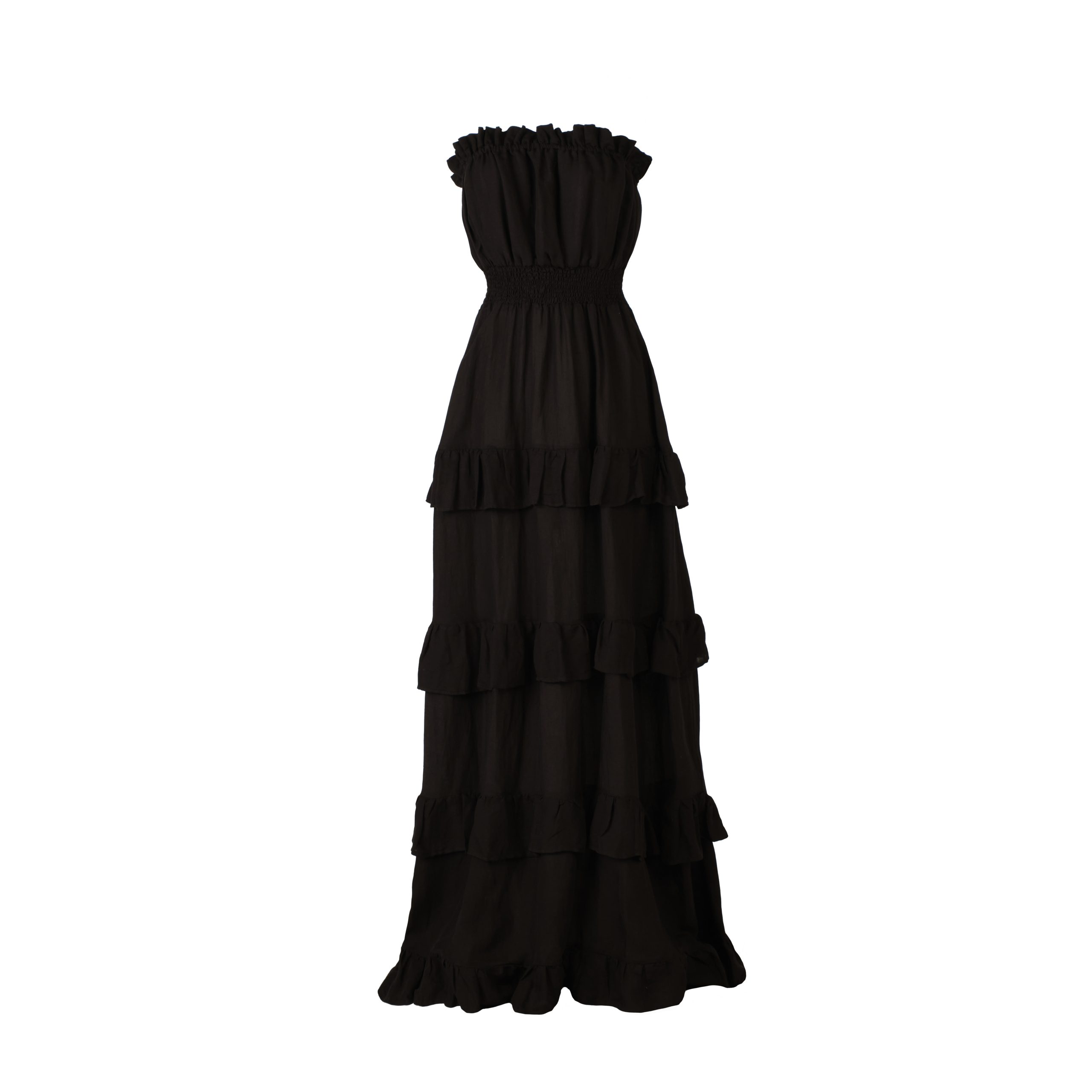 Strapless maxi dress with shirred waist and tiered flouncy ruffles allover