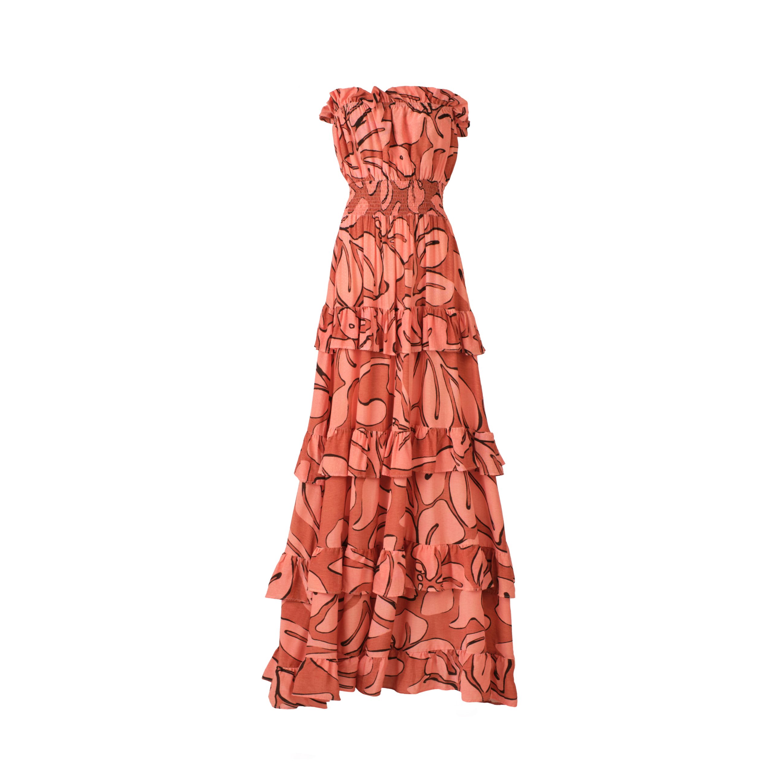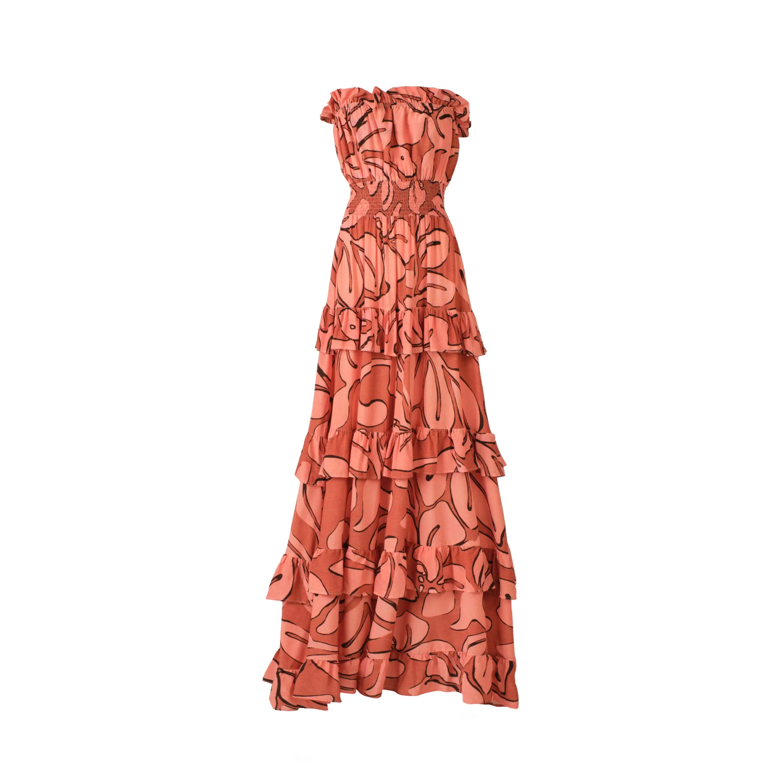Strapless maxi dress with shirred waist and tiered flouncy ruffles allover