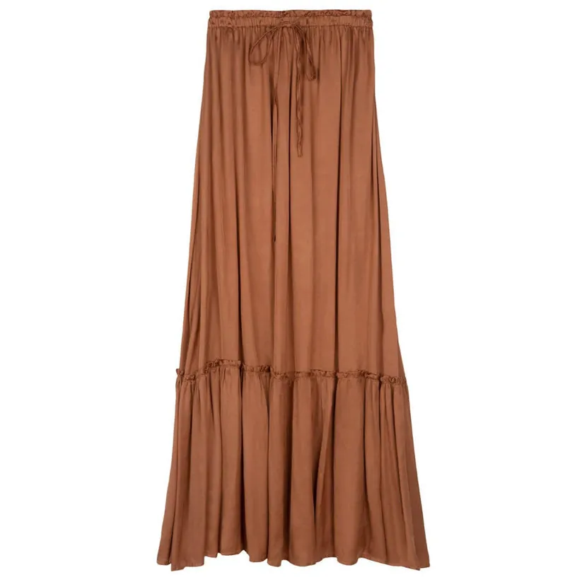 Αέρινη, κυματιστή, γεμάτη ζωντάνια φούστα, που δημιουργεί mood Ριβιέρας και boho πολυτέλειας. Κολακευτικός σχεδιασμός, ανάλαφρο ύφασμα, μπορεί να φορεθεί ψηλά ή χαμηλά για διαφορετικά στυλ. Με πλούσιο όγκο στον ποδόγυρο, θα σας προσφέρει μία άκρως καλοκαιρινή εμφάνιση με διάχυτο θεατράλε ύφος.