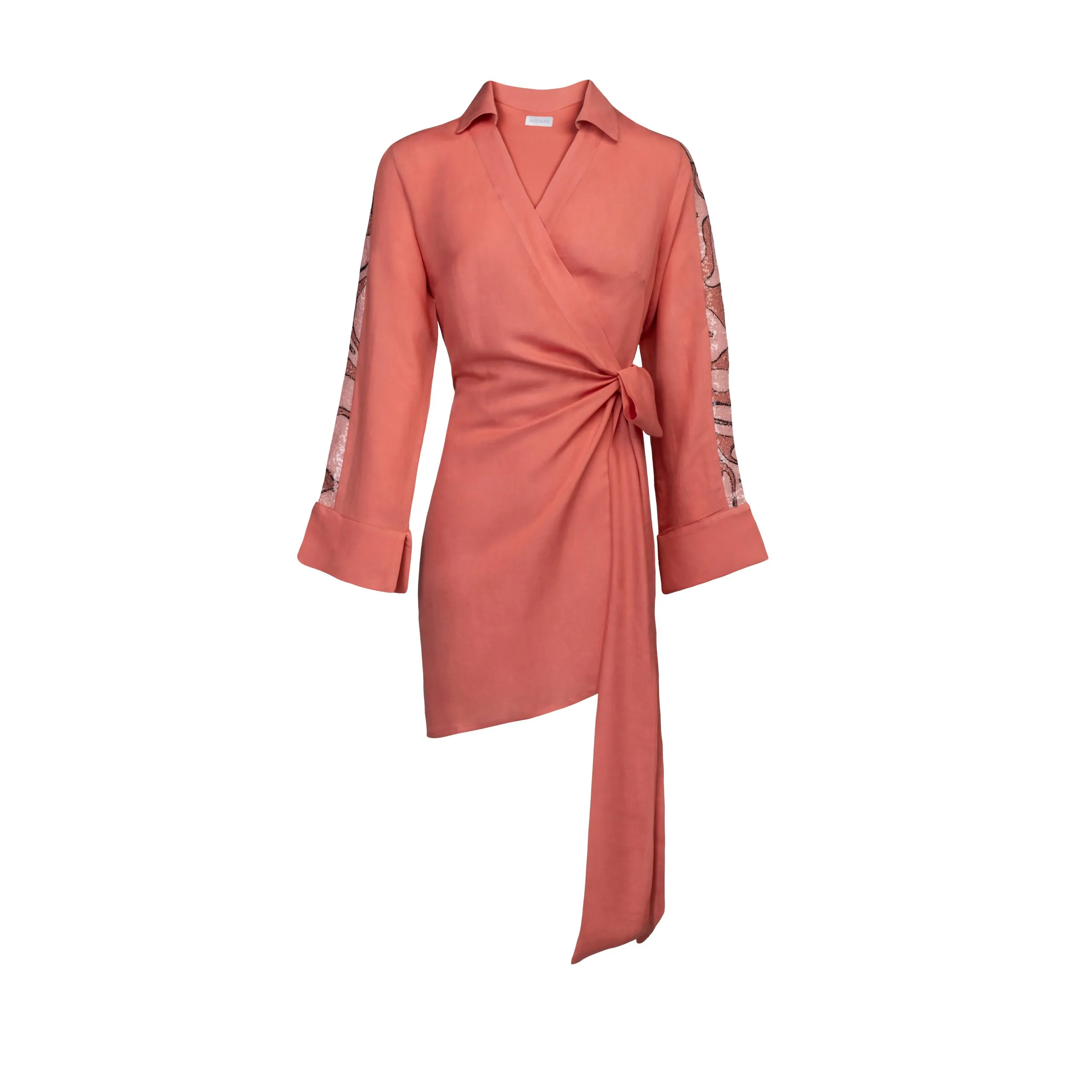 Wrap shirt dress with sequin sleeve embellishments and side tie